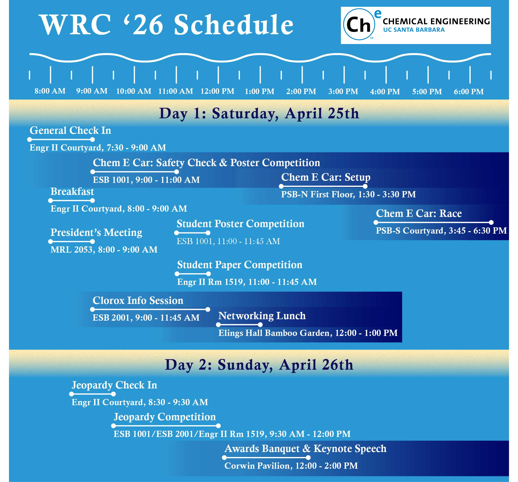 AIChE at UCSB is excited to announce we will be hosting the 2026 WRC at our campus in sunny Santa Barbara, California from April 24th to 25th. Please see the agenda below for competition and event details.